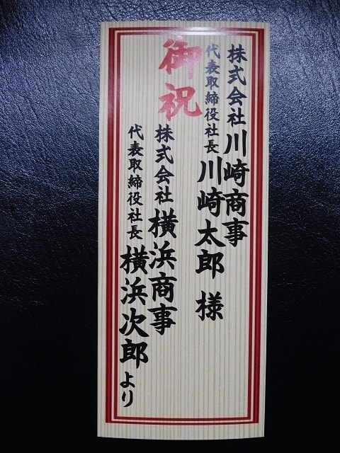 頭書き(お名札の一番上に記載する朱文字)は「御祝」の他に「祝開店」「祝○周年」「祝落成」「祝竣工」「祝御移転」「祝開業」「祝開院」「祝優勝」などとお入れすることもできます。ご不明な点はお電話などでお問い合わせください。