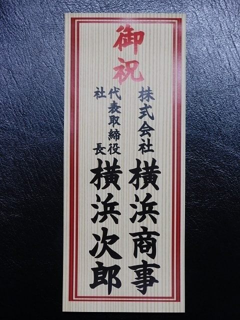 頭書き(お名札の一番上に記載する朱文字)は「御祝」の他に「祝開店」「祝○周年」「祝落成」「祝竣工」「祝御移転」「祝開業」「祝開院」「祝優勝」などとお入れすることもできます。ご不明な点はお電話などでお問い合わせください。